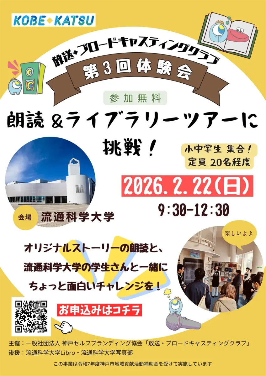 2つの楽しい体験ができる、ワクワクが詰まった一日です♪本を読むのが大好き!喋ることが大好き!また人前で話すことが苦手…な人も大歓迎♪アナウンサーなどプロの指導者&大学生サポーターが丁寧に指導します。普段中々入ることができない、流通科学大学の図書館で、楽しい体験をしてみよう!