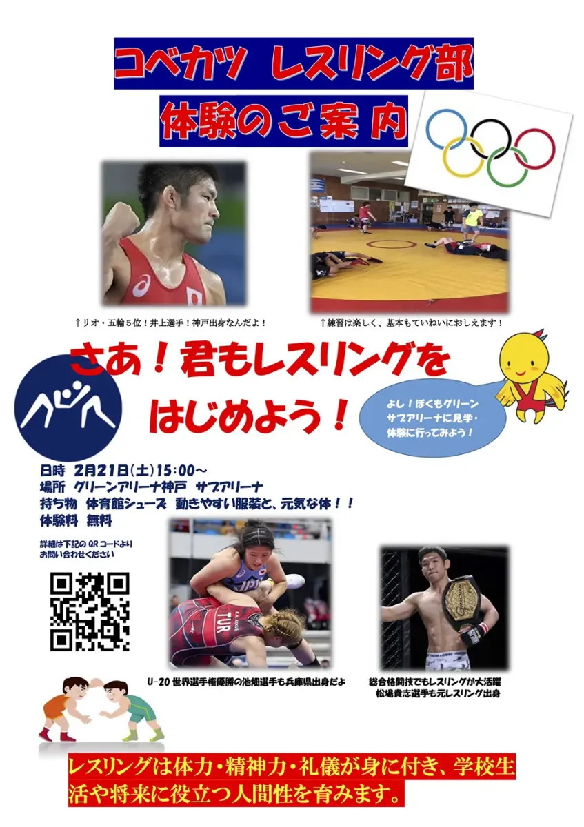 コベカツ登録団体の神戸市レスリング協会です。コベカツに先立ちまして、2月下旬にレスリングの体験会を実施いたします。レスリングの体操や基本的な動きを中心に、楽しくレスリングに取り組みます。興味のある方は是非お待ちしております。